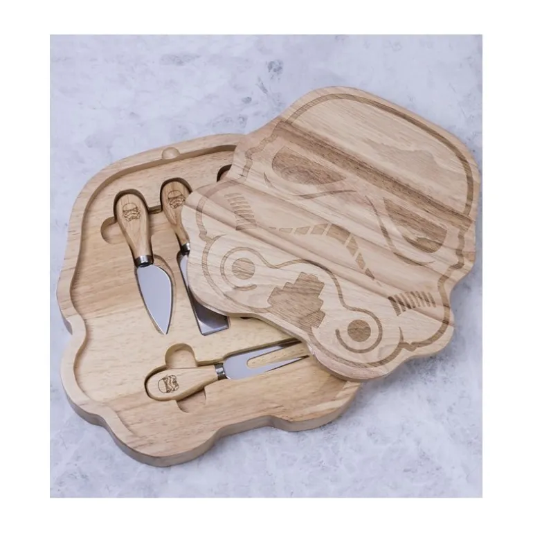Esto es exactamente lo que parece: una maravilla de set gourmet para hacer tablas de quesos. La tabla está genialmente diseñanda, con las forma del casco de los Soldados Imperiales o Stormtrooper de Star Wars. Está pensada para ser usada como tabla para cortar y servir al mismo tiempo y en su interior se pueden almacenar las cuatro herramientas imprescindibles para el quesero gourmet.