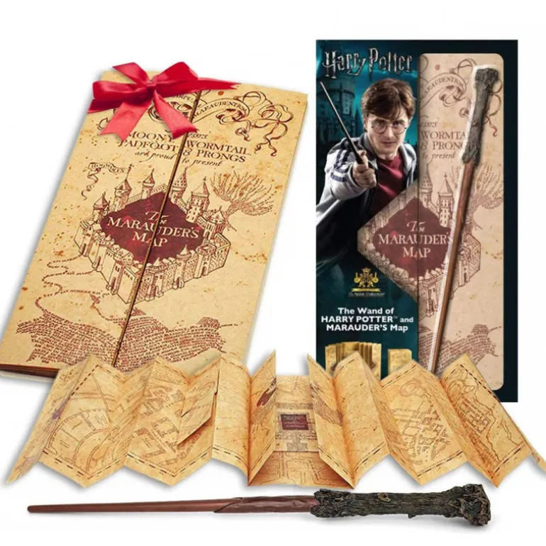 Un set realmente especial para aficionados de verdad al universo Harry Potter, nada menos que un conjunto de dos réplicas de colección, compuesto por dos objetos tan emblemáticos como la varita mágica de Harry y el Mapa del Merodeador.