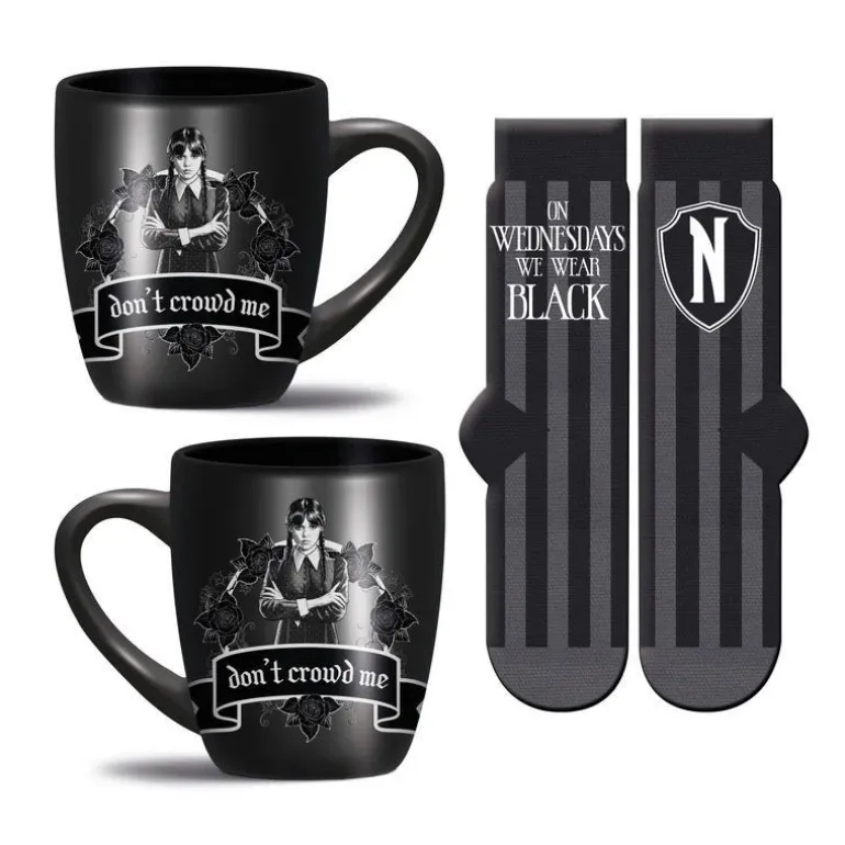Descubre el elegante set regalo Wednesday, perfecto para los seguidores de Miércoles Addams. Este conjunto incluye una taza de cerámica negra de 315 ml, decorada con una imagen de Miércoles y la frase «Don’t crowd me«. Es ideal para disfrutar de tus bebidas favoritas, ya que es apta para microondas y lavavajillas. Complementando el conjunto, se encuentran unos elegantes calcetines en talla única 36-41, en color negro con rayas grises y el texto «On Wednesdays we wear black«. Un regalo original y práctico que cualquier admirador de este icónico personaje apreciará.
