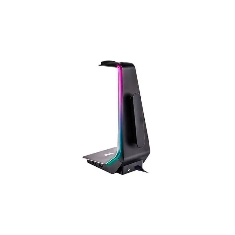 Un soporte con una construcción ligera y duradera en aluminio, con cabezal y base de goma para que no se deslicen tus cascos y tenga una gran estabilidad; además de una genial iluminación RGB personalizable a través del software del motor iTAKE en los bordes. También cuenta con un práctico soporte de cable, así como dos puertos USB 3.0 y un conector de audio de 3,5 mm. para un plug & play sencillo y sin problemas.