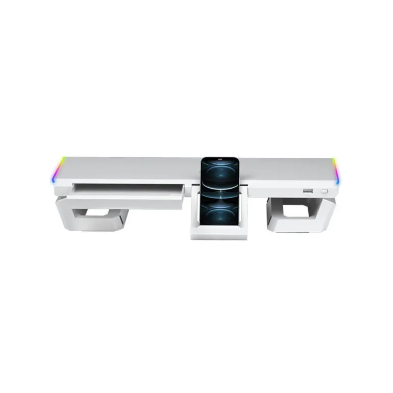 SOPORTE PREMIUM PARA MONITOR MGS-ONE. Soporte premium para monitor con iluminación avanzada CHROMA RGB, puerto USB 2.0, soporte para móviles/tablets y cajón para almacenaje. Totalmente ajustable con 3 tamaños diferentes gracias a sus laterales plegables.