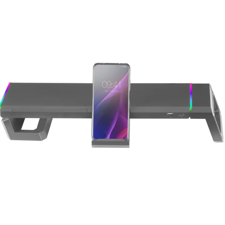 SOPORTE PREMIUM PARA MONITOR MGS-ONE. Soporte premium para monitor con iluminación avanzada CHROMA RGB, puerto USB 2.0, soporte para móviles/tablets y cajón para almacenaje. Totalmente ajustable con 3 tamaños diferentes gracias a sus laterales plegables.
