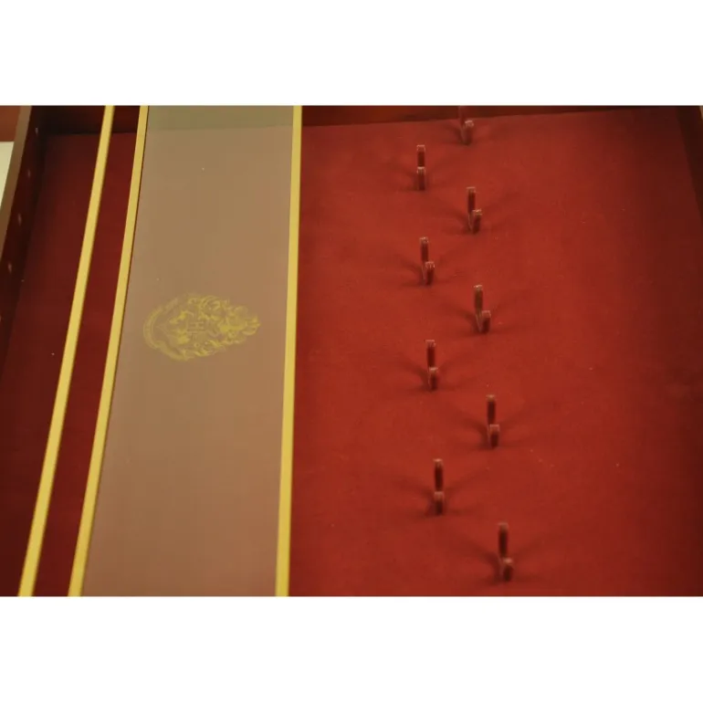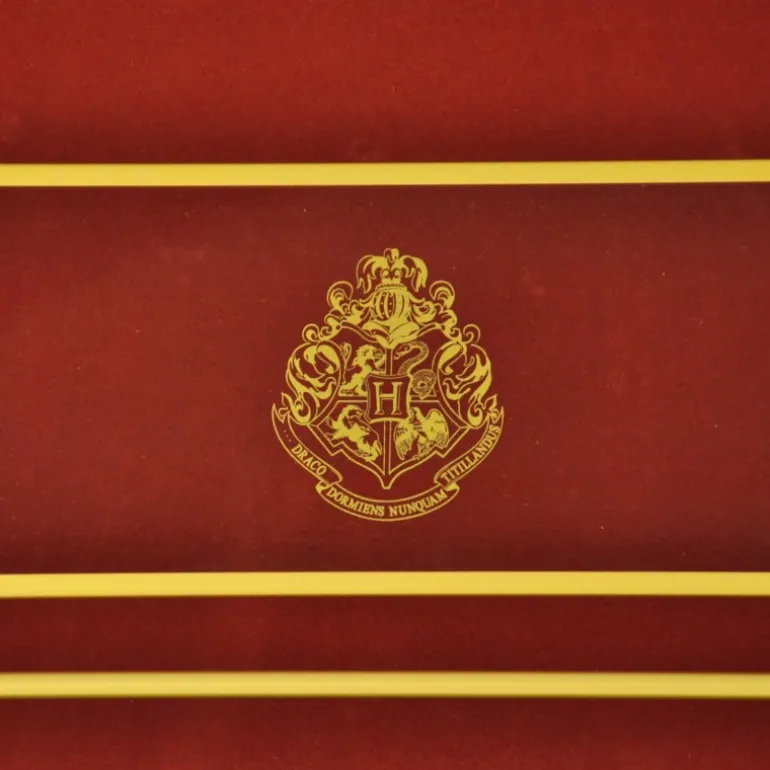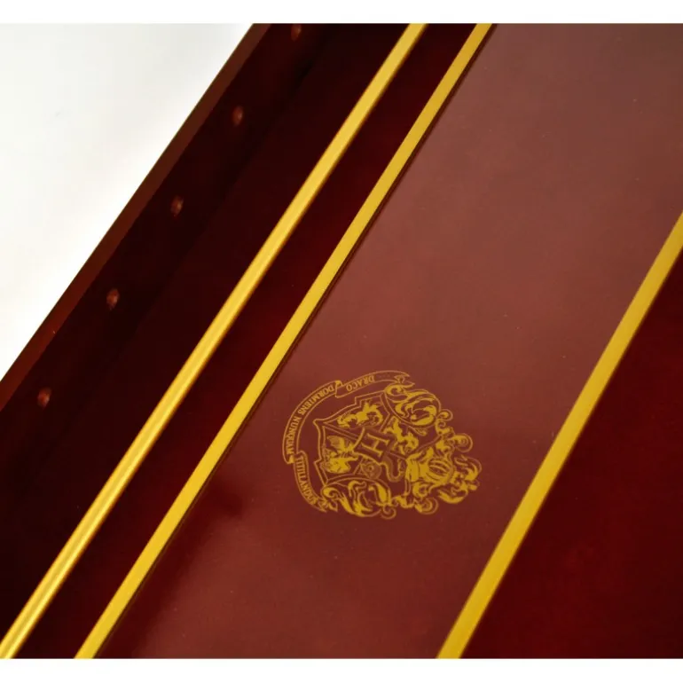 Lleva en dorado el escudo de Hogwarts y bajo esa franja tiene una barra para, si estás siguiendo la edición carácter de las varitas, poner la chapita con el nombre del propietario de la varita. Si sigues la edición Ollivander’s no pasa nada, también encajan a la perfección en este soporte y queda igualmente elegante, ya que tanto las varitas de ambas colecciones como el propio expositor, han sido creados por el prestigioso fabricante The Noble Collection.