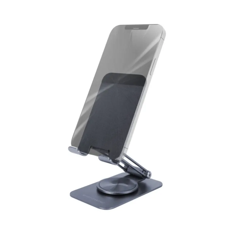SOPORTE PARA SMARTPHONE MA-RSS. Experimenta la innovación y el estilo con el soporte para smartphone MA-RSS, tu compañero ideal para una vida digital más cómoda y elegante. Fabricado en aluminio, el MA-RSS es un accesorio ligero, portátil y resistente. Con su capacidad de rotación de 360º y ajuste de altura y ángulo de inclinación de 180º, este soporte te permite personalizar completamente la visualización de la pantalla de tu smartphone. Su diseño fino y plegable es perfecto para dispositivos de hasta 10”, optimizando tu espacio y manteniendo tu área de trabajo despejada y organizada. Además, la base antideslizante con almohadillas de silicona ofrece una estabilidad inigualable.