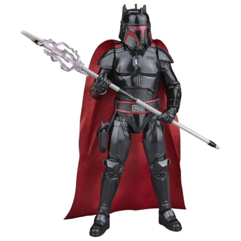 El acabado en negro brillante con detalles en rojo otorga a la armadura un aspecto futurista y amenazante, acompañado de una capa roja que añade un toque dramático. La figura está equipada con un casco removible y un rifle de energía, permitiendo a los coleccionistas y fans recrear con autenticidad las aventuras de la serie.