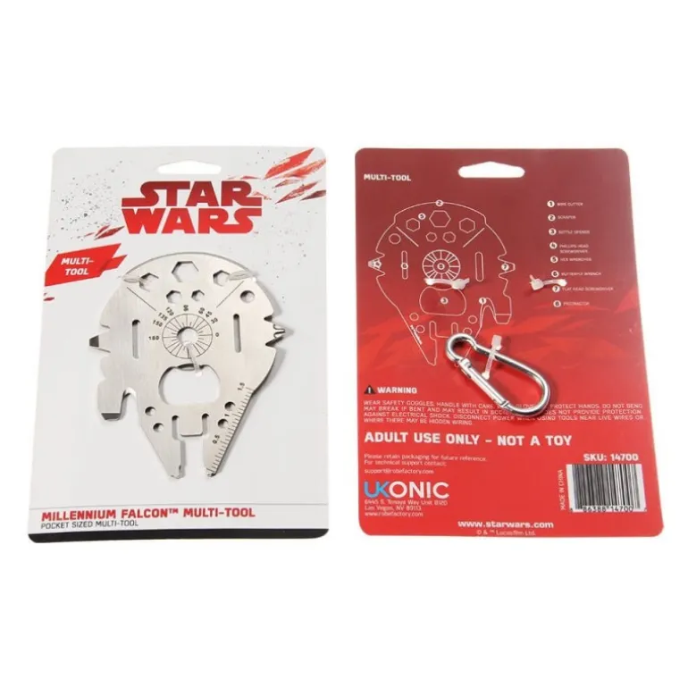 Descubre el Star Wars Multi-Tool Millennium Falcon, un práctico gadget con diseño inspirado en la famosa nave espacial de Star Wars. Este multi-herramienta de bolsillo, fabricado por Ukonic, es perfecto para los fans de la saga. Con licencia oficial, combina funcionalidad y diseño al ofrecer múltiples herramientas en una estructura compacta.