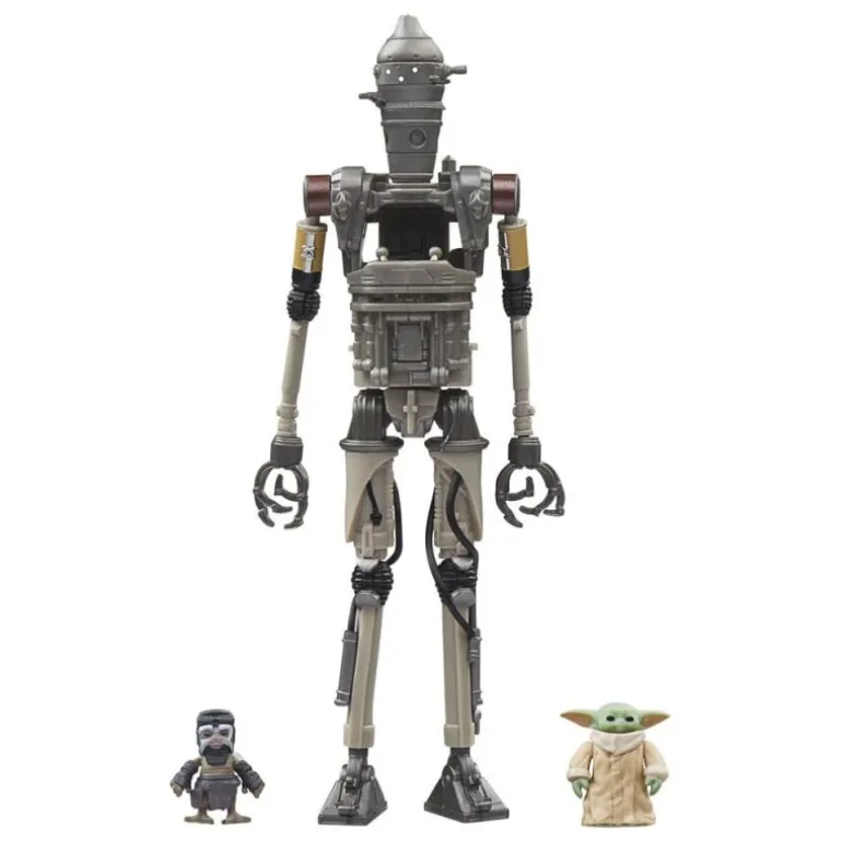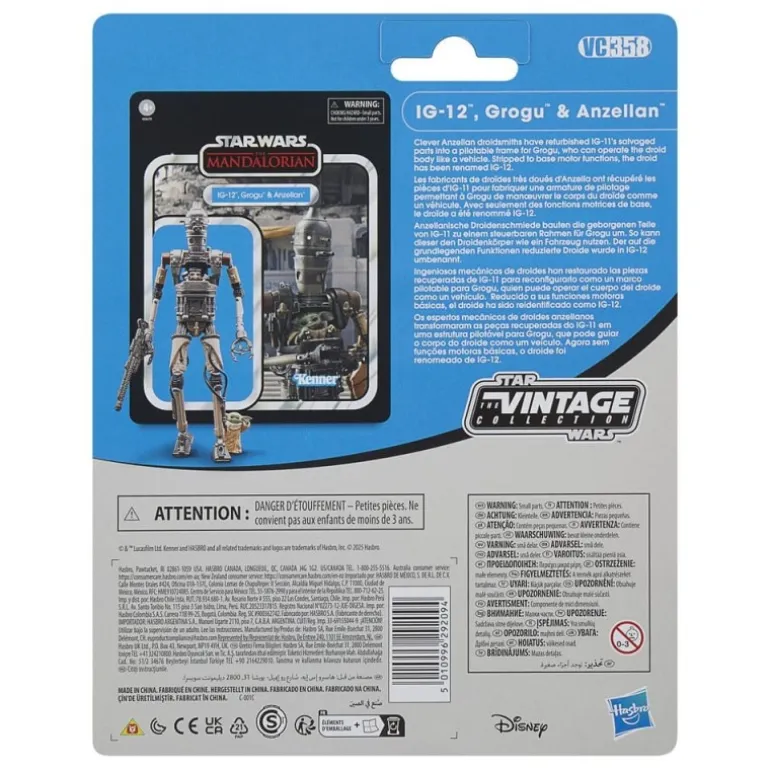 Descubre el Pack de 3 Figuras Star Wars: The Mandalorian Vintage Collection con IG-12, Grogu y Anzellan. Estas figuras de acción, detalladamente diseñadas, miden 10 cm y son perfectas para cualquier fan de la saga. IG-12 presenta un acabado metálico con detalles mecánicos, mientras que Grogu se muestra con su icónica vestimenta. El Anzellan aporta un toque de singularidad al conjunto.
