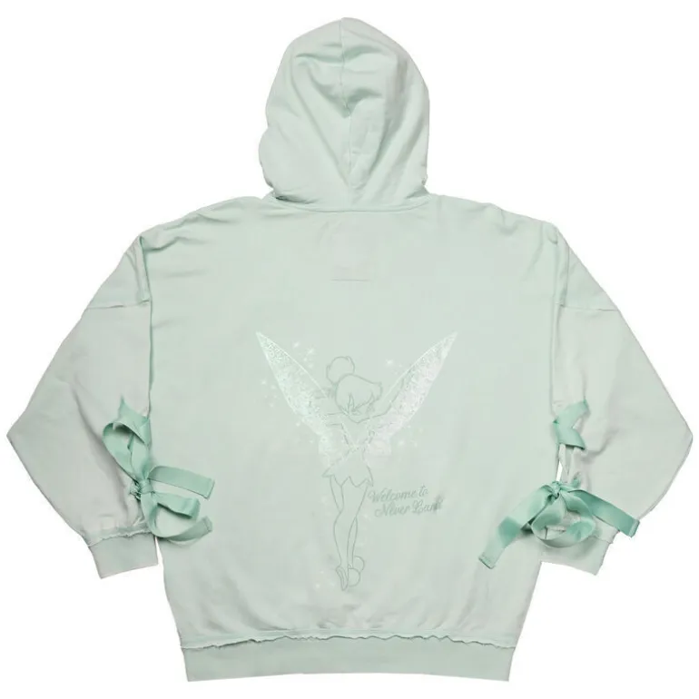 La sudadera se presenta en un suave color verde menta que aporta frescura y estilo al look. En la parte posterior, luce una imagen de Campanilla con sus icónicas alas brillantes y la frase «Welcome to Never Land» en elegante tipografía. Este detalle asegura que la prenda sea un verdadero punto de atracción.