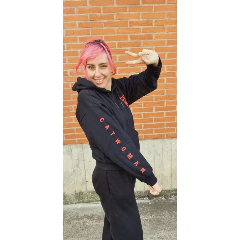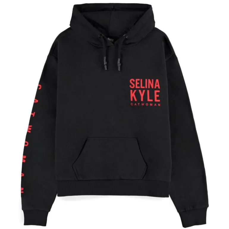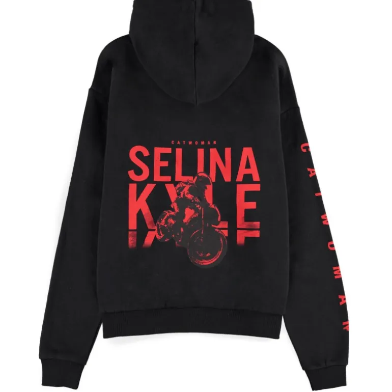 Es una sudadera con el corte clásico de capucha y bolsillo delantero, de esas que le quedan bien a todo el mundo. Pero lo mejor es su genial diseño, en una perfecta combinación de colores rojo y negro y con el nombre de pila de la mítica Catwoman, Selina Kyle, en pequeñito en la parte de delante y en grande en la parte de atrás, en la que también aparece montada en la moto, tal y como aparece en la película The Batman. Fíjate a demás en el detalle de la manga, que lleva también el nombre de Catwoman.