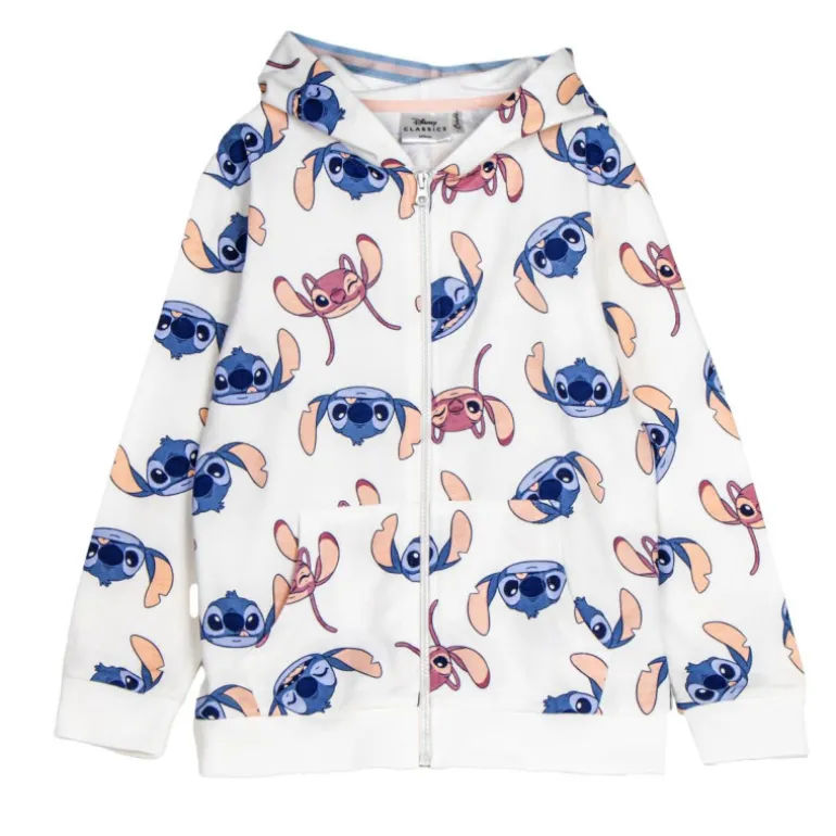 El diseño presenta un vibrante estampado de Stitch, en tonos azules y rosas, sobre un fondo blanco que añade un toque moderno y divertido. La sudadera cuenta con una práctica cremallera frontal y capucha, lo que permite un ajuste cómodo y fácil de poner y quitar.
