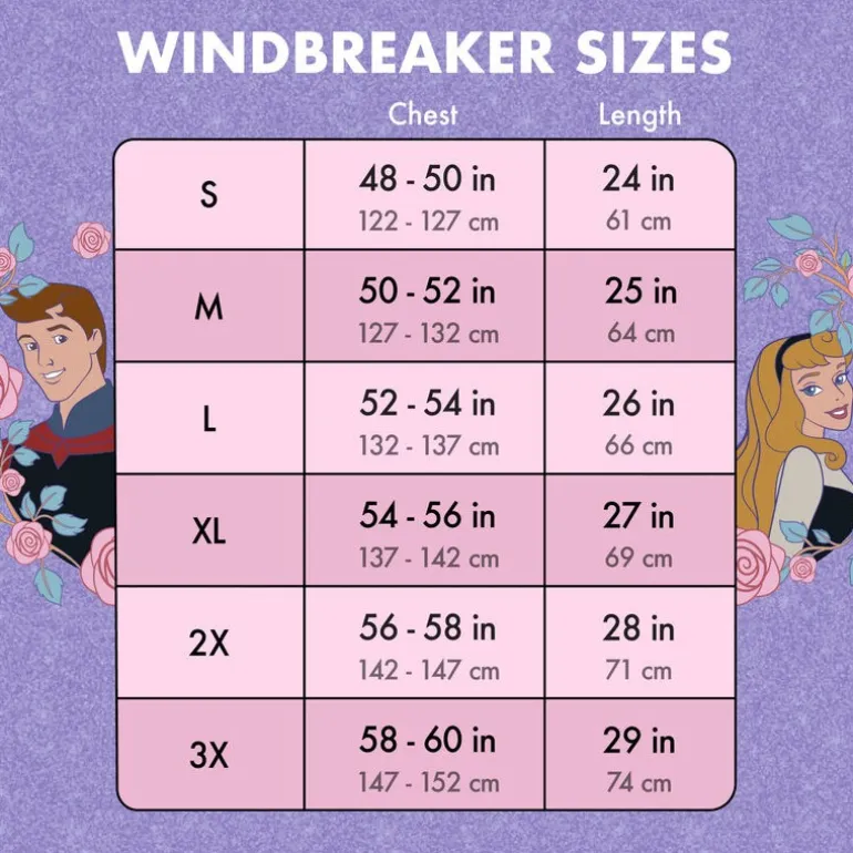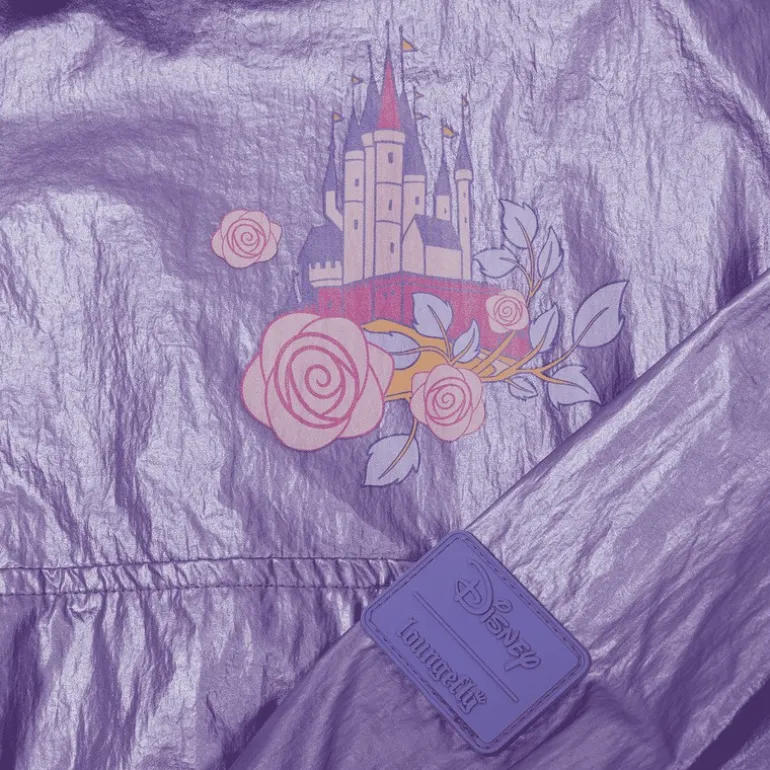 Descubre la sudadera cortaviento con un encantador diseño de Princesa Aurora y Príncipe Phillip de Loungefly. Este producto con licencia oficial Disney es perfecto para los amantes de los cuentos de hadas. Confeccionada en un tono lila brillante, esta sudadera presenta un detallado estampado en la parte posterior donde los personajes están rodeados de rosas. Además, posee un pequeño dibujo del castillo de cuento en el frente. Su material ligero y de calidad es ideal para usar en días de viento, combinando estilo y funcionalidad.