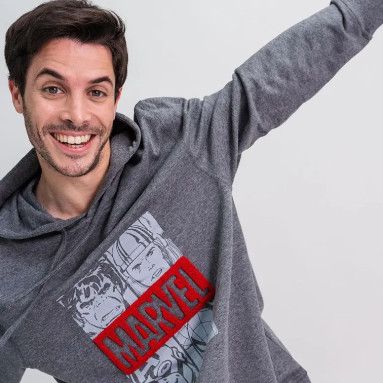 Es una sudadera con capucha y bolsillo canguro, de esas que le quedan bien a todo el mundo. Pero lo mejor es su genial diseño en una perfecta combinación de colores gris, blanco y rojo, con el conocido logo de Marvel en el pecho.
