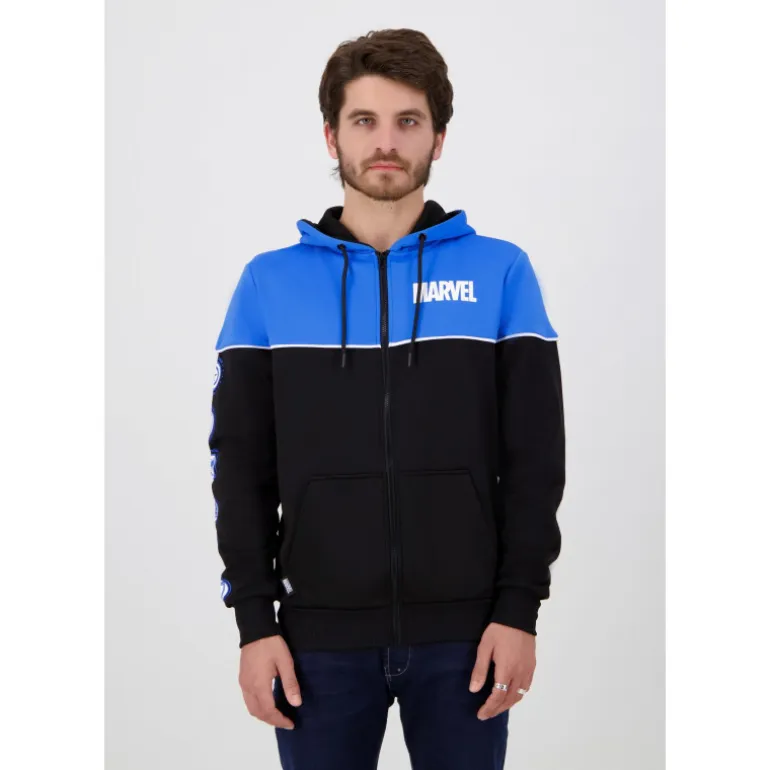 Es una sudadera con el corte clásico de cremallera y capucha, de esas que le quedan bien a todo el mundo. Pero lo mejor es su genial diseño, en una perfecta combinación de colores azul y negro y con el conocido logo de Marvel en el pecho y no te pierdas los detalles como los logos de los superhéroes en la manga de la chaqueta.