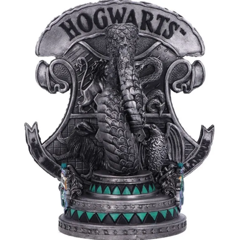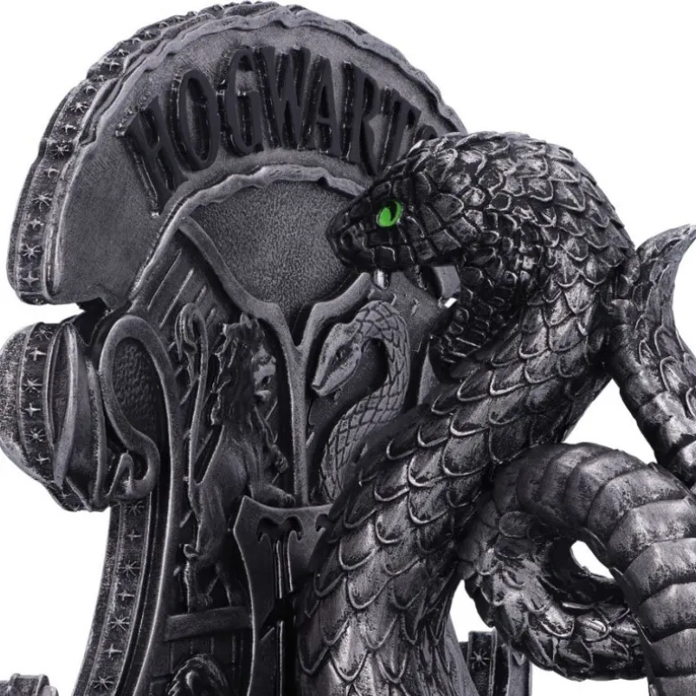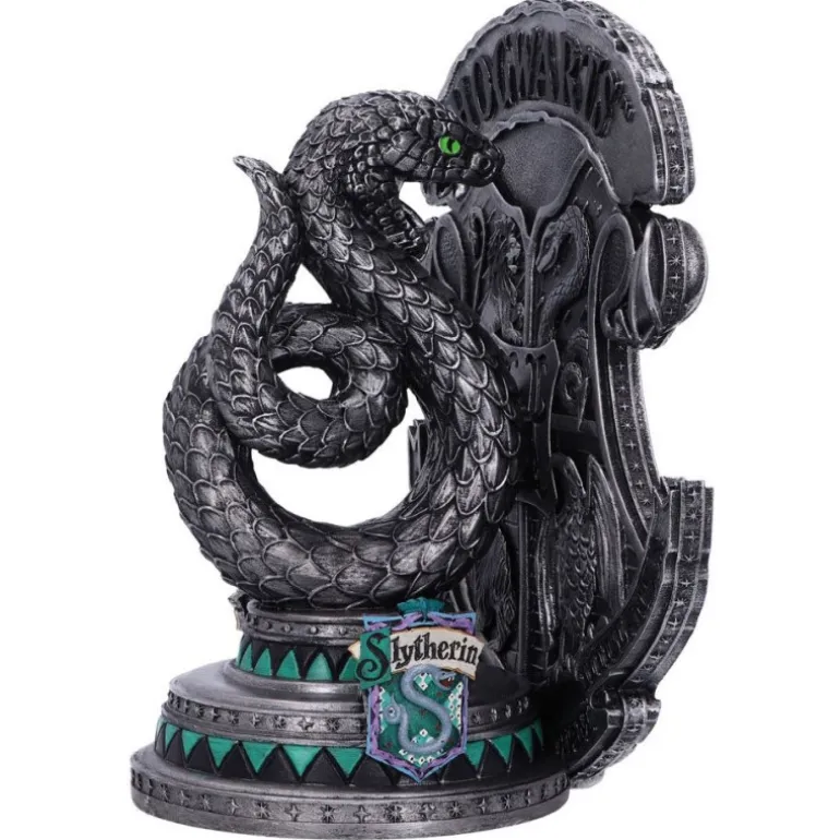La figura esta fabricada en poliresina y pintadas cuidadosamente a mano. Tienen unas medidas de 20 cm y es un producto fabricado por Nemesis Now con licencia oficial de Harry Potter. Es una figura basada en la casa de Slytherin que aparece la serpiente sujetando el escudo de Hogwarts.