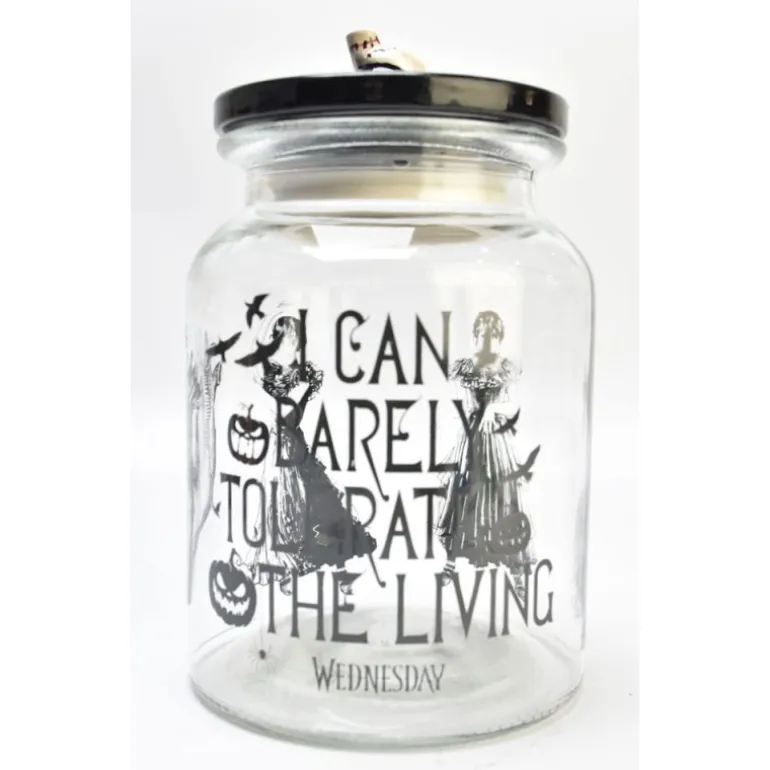 Descubre este tarro de golosinas con licencia oficial de Wednesday Addams, perfecto para los verdaderos admiradores de la mítica serie. Este elegante tarro está adornado con imágenes icónicas de miércoles y citas famosas que capturan la esencia del personaje.