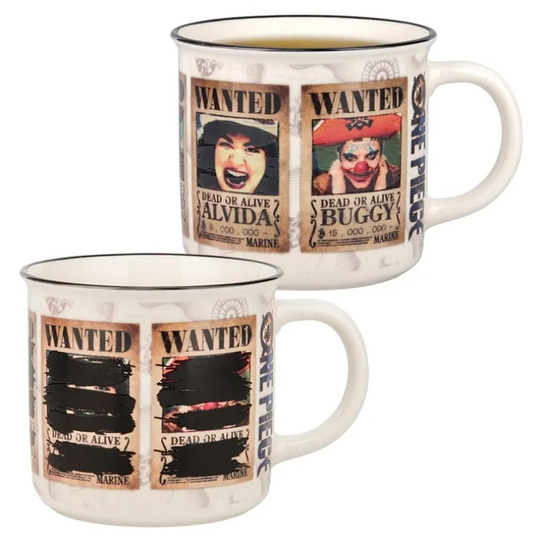 Descubre la taza de cambio al calor de One Piece, un producto oficial de Paladone que traerá emoción a tus desayunos. Esta taza presenta un diseño espectacular inspirado en los cartelones de ‘Se busca’ con personajes icónicos de la serie, como Monkey D. Luffy y Arlong. Al verter una bebida caliente, la taza revela imágenes ocultas, creando un efecto mágico que sorprenderá a todos los fans.