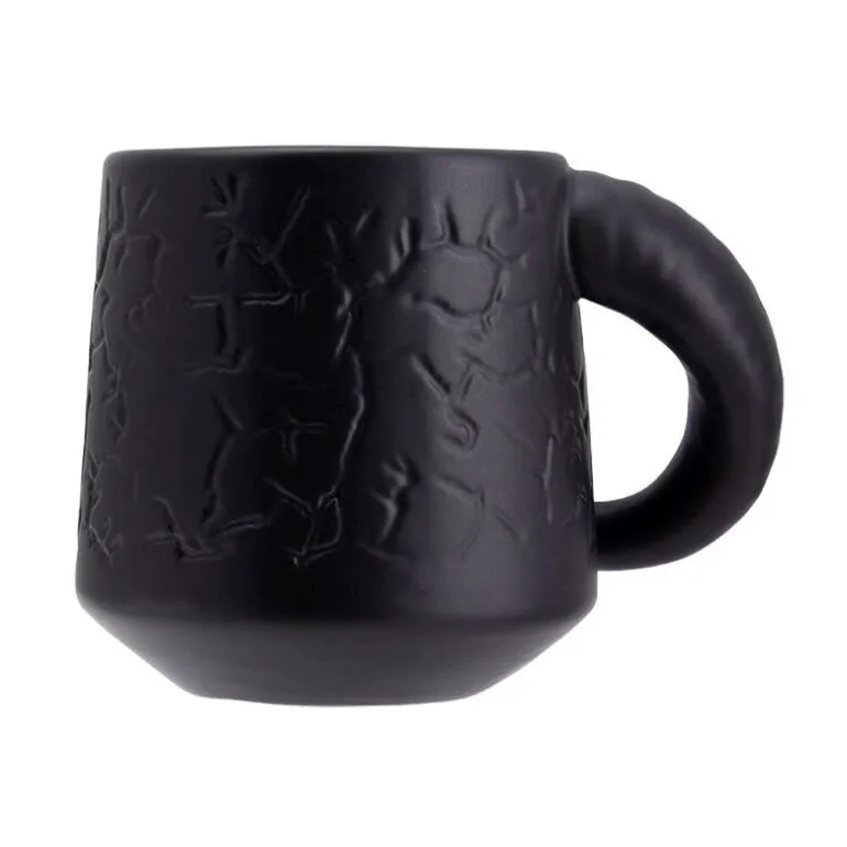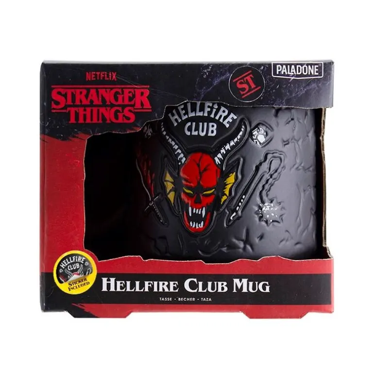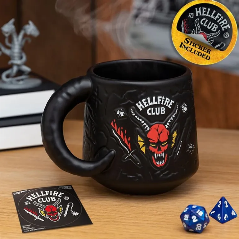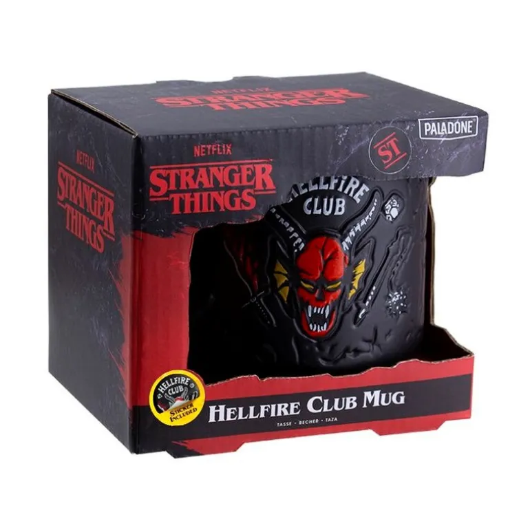 Se trata de una taza con aspecto muy original, con una superficie rugosa, en color negro y con un aspecto carbonizado diferente al de cualquier otra taza, y con el famoso logo del Hellfire Club reproducido en relieve. Un diseño de esos que no dejan indiferente y con el que podrás pegarte unos desayunos llenos de energía, por si te persigue algún demogorgon y tienes que salir corriendo. Además, viene con un sticker de este Hellfire Club al que pertenecen personajes tan queridos como Dustin, Mike o Eddie.