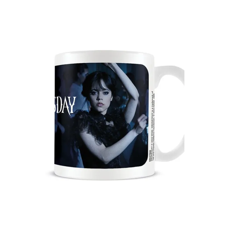La taza de Miércoles bailando es un producto de la marca Pyramid International, con dimensiones de packaging de 12 x 8,7 x 10,5 cm. Esta taza cuenta con imágenes de la icónica escena del baile de la serie de Netflix de Miércoles.