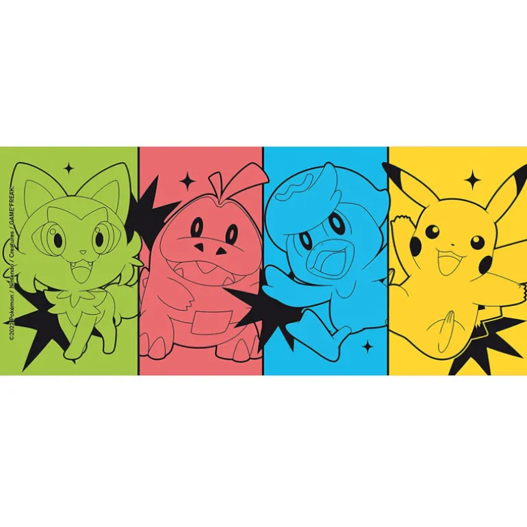 Se trata de una taza con un fantástico diseño, protagonizado por los Pokemons iniciales de las ediciones Escarlata y Púrpura del videojuego de Nintendo, Pokemon. Aparecen Sprigatito, Fuecoco, Quaxly y Pikachu