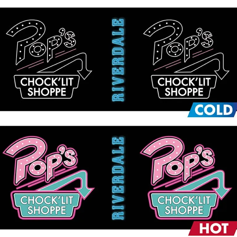 Es una taza oficial cuyo diseño es de un elegante color negro, sobre el que solo vemos el cartel del mítico bar restaurante Pop’s, como si el neón estuviera apagado, pero cuando llenas el interior de la taza de líquido caliente, el diseño cambia y este cartel se llena de colores, con ese color rosa tan característico.