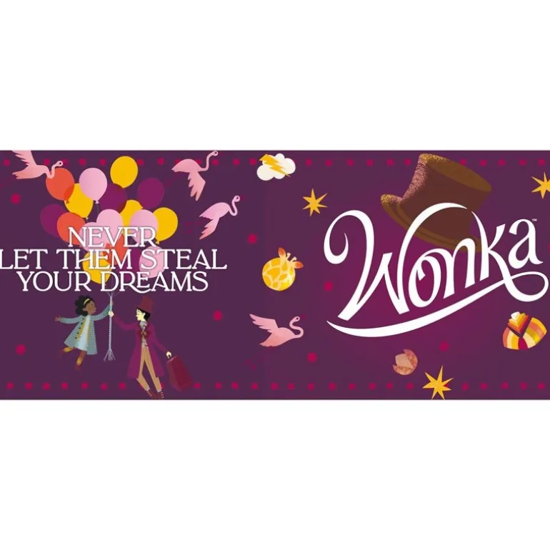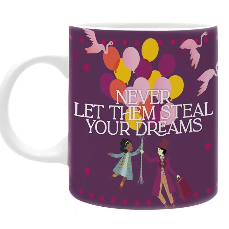 Una taza cuyo diseño con la temática de Wonka, lleno de duces, el logo y la fresa «Never let them steal your dreams».