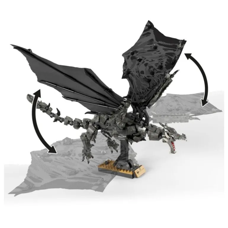El dragón es principalmente de color gris oscuro y negro, con detalles que simulan perfectamente las escamas y la estructura imponente de Alduin. Las alas, de gran envergadura, son un espectáculo visual, aportando un realismo sorprendente. Además, viene con una mini figura de un guerrero, listo para enfrentarse al poderoso dragón.