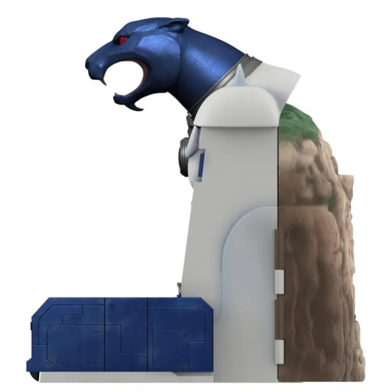 Fabricada por Super7 con materiales de alta calidad y acabados premium, esta pieza de coleccionista mide 72 x 91 x 88,5 cm y pesa más de 27 kilos, asegurando una presencia imponente en cualquier colección. El diseño captura a la perfección el emblemático rostro felino y el símbolo rojo de los ThunderCats en la entrada, así como la combinación de tonos azules, plateados y grises que evocan el aspecto original de la serie.