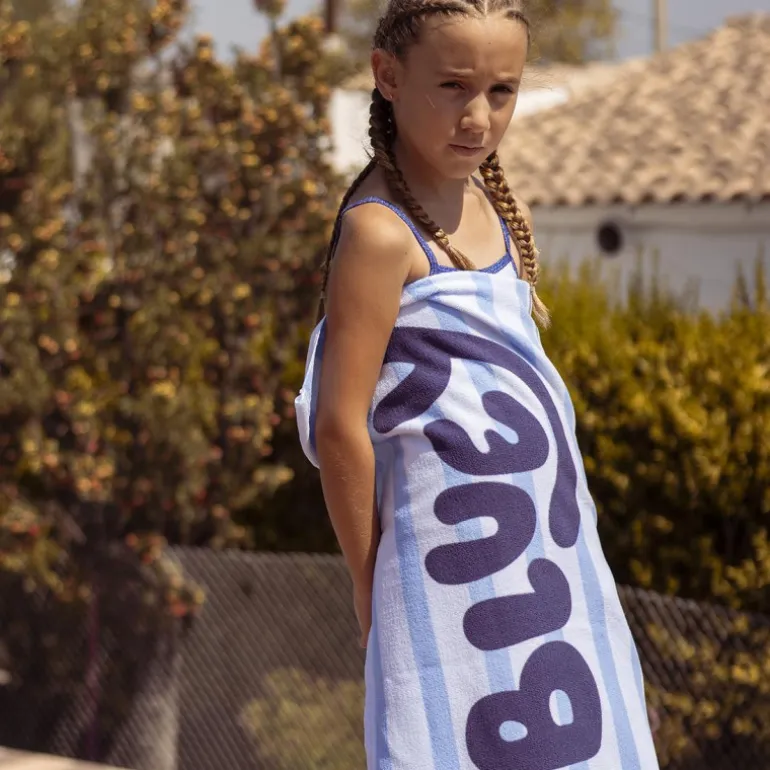 Las rayas horizontales en tonos de azul crean un diseño atractivo y moderno, mientras que el nombre Bluey se presenta en un estilo divertido que atraerá la atención de los niños. Ideal para madres que buscan productos que combinen funcionalidad y estilo, esta toalla será un compañero perfecto para cualquier actividad acuática.
