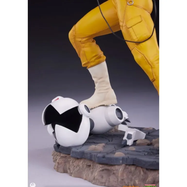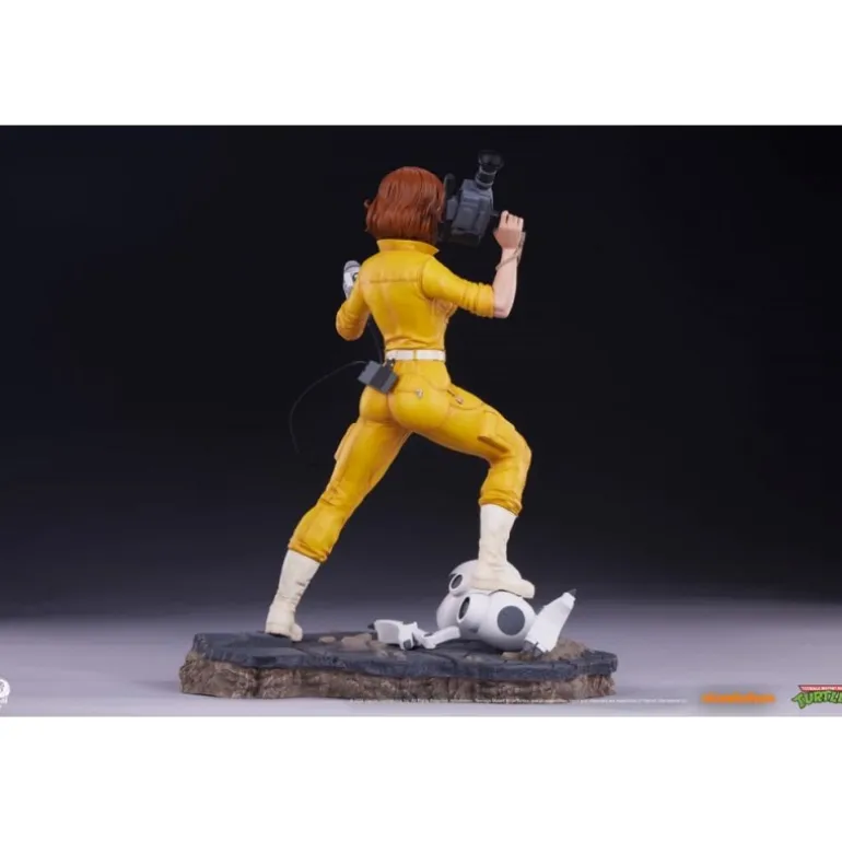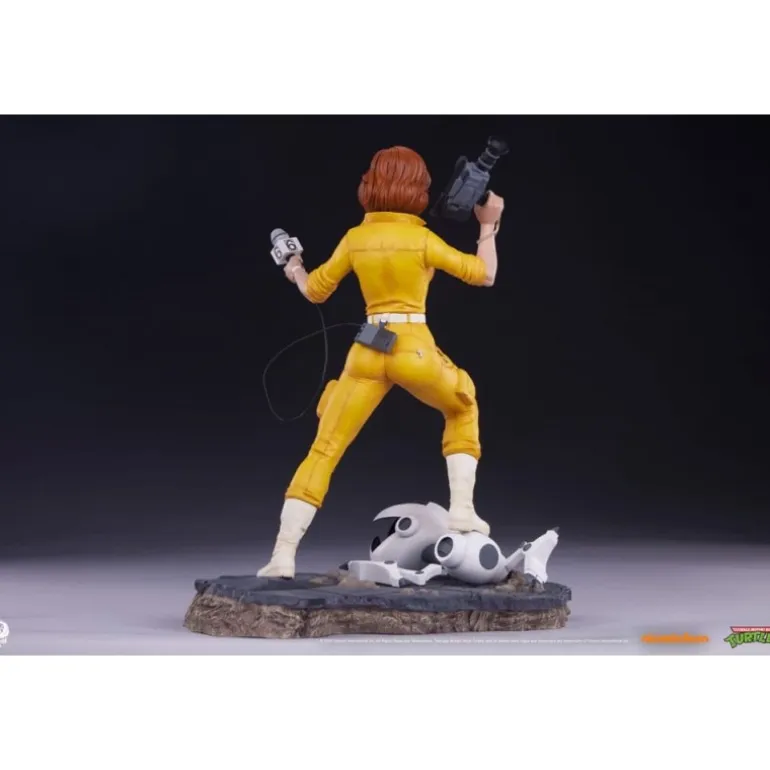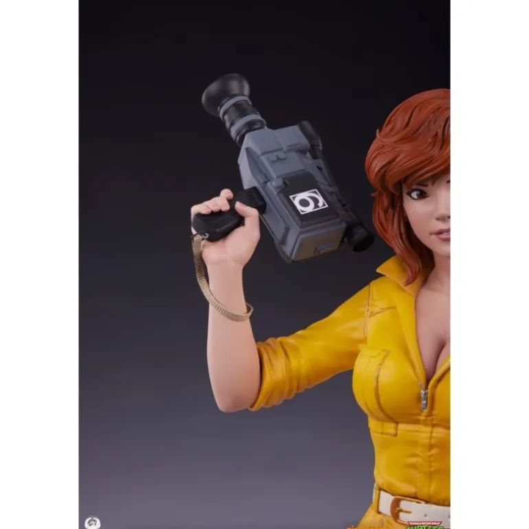 El modelado y la pintura manual destacan por su fidelidad y precisión, capturando la esencia del personaje con su icónico mono amarillo y su equipo de cámara en mano. Además, la base añade un toque dinámico, mostrando elementos de la saga para contextualizar todavía más a April.
