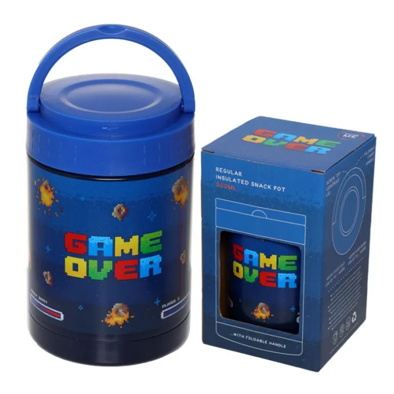 Pero si aún no te convences, no te pierdas su fantástico diseño, con ese Game Over que tan acostumbrados estamos a ver en los juegos de esas míticas máquinas arcade, y ese genuino estilo pixelado de los juegos clásicos. Está fabricado en plástico y acero inoxidable, cuenta con 500 ml de capacidad y mide unos 14 cm de alto.