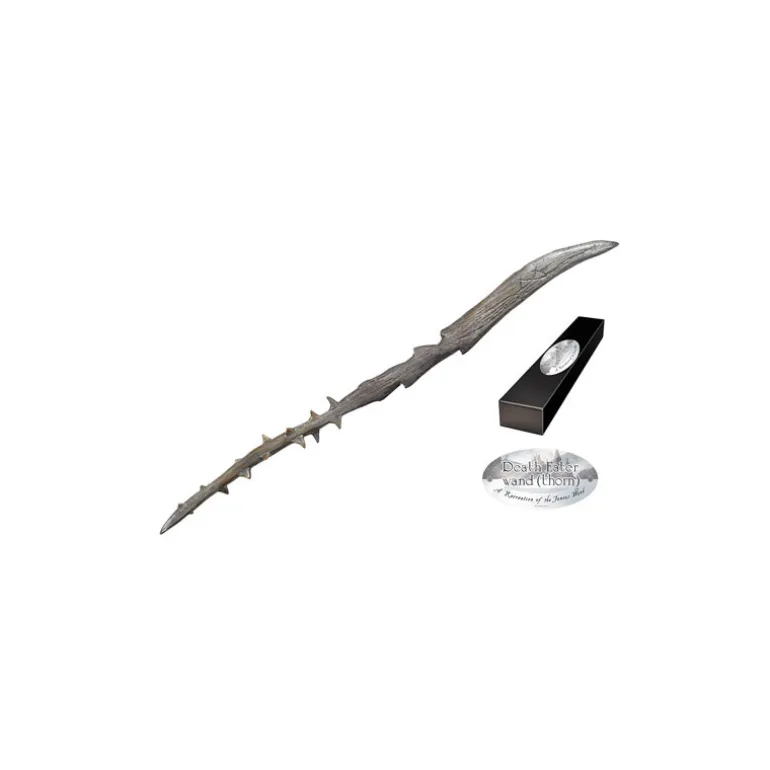 Mide unos 28 cm de largo y es una pieza original y oficial del prestigioso fabricante de réplicas de cine The Noble Collection, por lo que tiene un gran realismo y parecido a las que hemos visto en las películas de Harry Potter. En este caso de trata de una varita con espinas que sin duda impresionará a todo el que venga a tu casa y la vea expuesta en tus baldas.