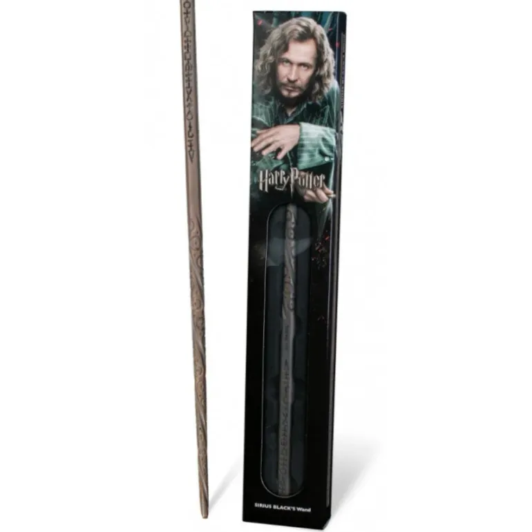 Se trata de una réplica de unos 38 cm que reproduce perfectamente la forma de la varita del que quizás sea el mago más misterioso de la saga, Sirius Black, con todos sus detallitos de la varita original, preparada para que hagas tus encantamientos o la expongas en una vitrina. Viene en una cajita o blister diseñada especialmente para ella y con la imagen del propio Sirius.