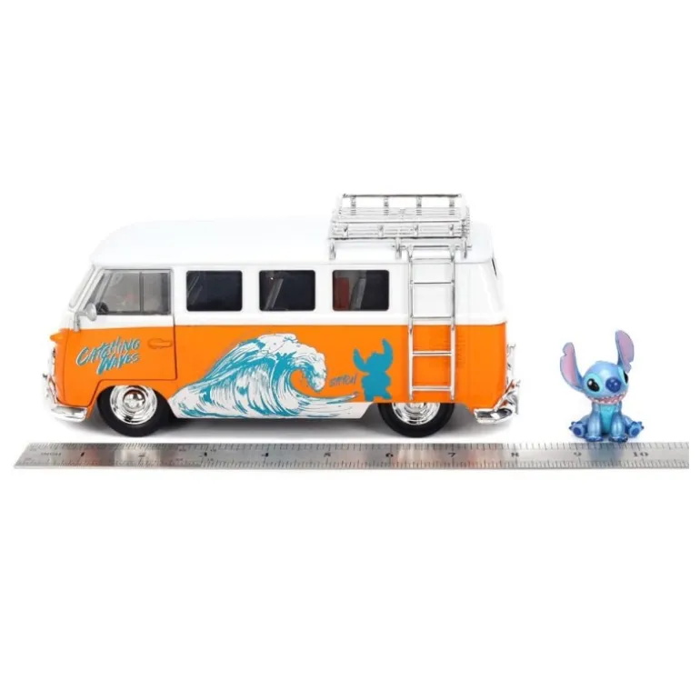 Descubre el encanto del **1961 VW Bus Stitch** a escala 1/24, un modelo de metal que captura la esencia de la película **Lilo & Stitch**. Fabricado por **Jada Toys**, este vehículo de colección está decorado con un vibrante diseño en blanco y naranja, presentando una ola azul y la silueta de Stitch. Las puertas y el capó se abren, añadiendo realismo y detalle a este modelo. Además, incluye una detallada figura de Stitch, también en metal, para complementar el conjunto.