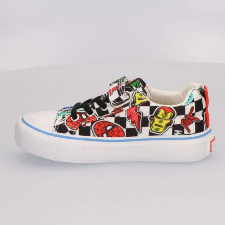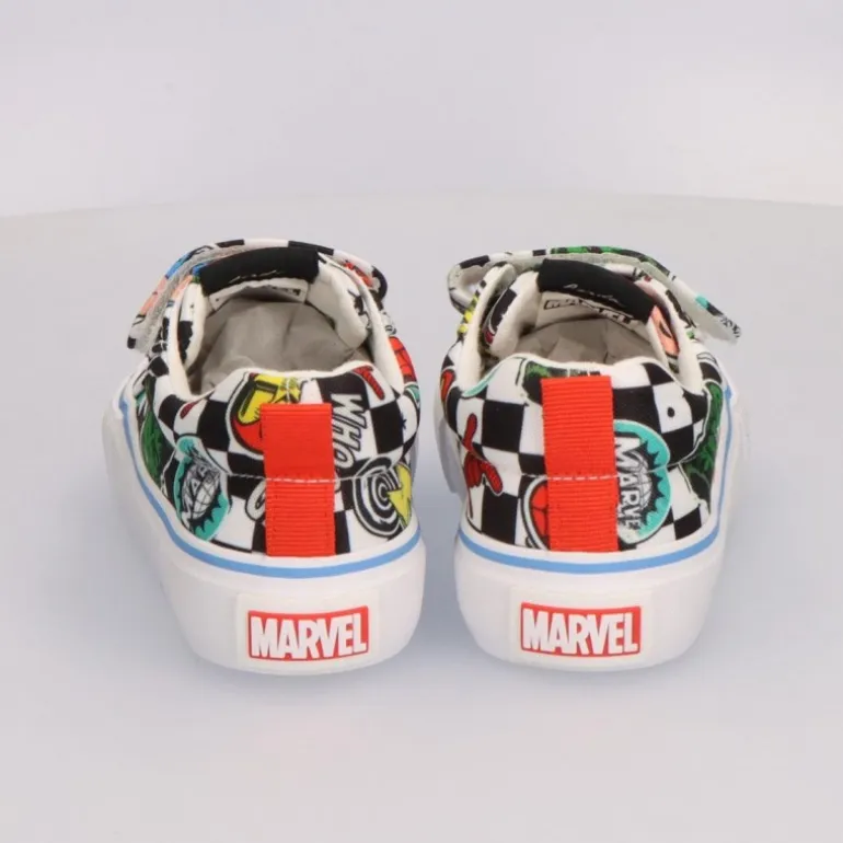 Descubre las zapatillas de loneta vulcanizadas Marvel, ideales para los pequeños fanáticos de los superhéroes. Estas zapatillas cuentan con un diseño colorido y vibrante que incluye gráficos de personajes icónicos como Hulk, Iron Man y Spiderman. El patrón de cuadros en tonos blanco y negro resalta los colores vivos de los personajes.