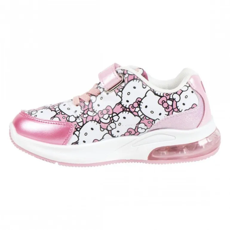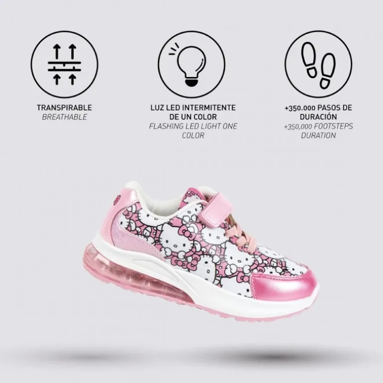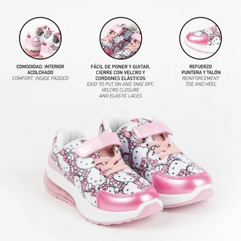Descubre las encantadoras zapatillas deportivas de Hello Kitty, ideales para las pequeñas aventureras. Con un diseño vibrante en colores rosa y blanco, estas zapatillas lucen un estampado de Hello Kitty que encantará a cualquier niña. Su suela de PVC con luces LED intermitentes agrega un toque especial, asegurando diversión a cada paso.