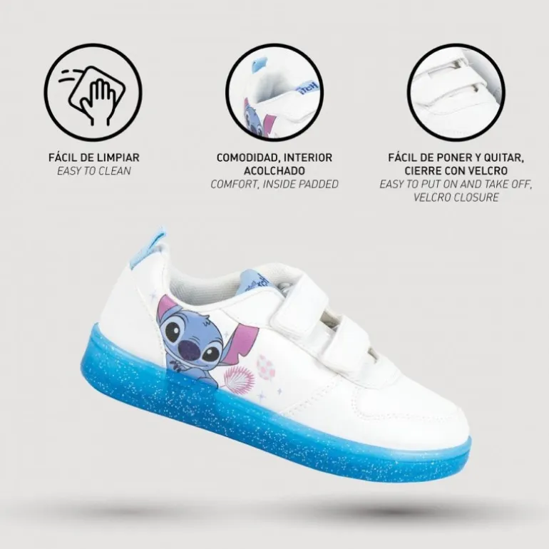 Estas encantadoras zapatillas deportivas de Stitch son el complemento perfecto para los más pequeños. Confeccionadas en una combinación de PU, poliéster y PVC, prometen durabilidad y confort. Su diseño en color blanco cuenta con la colorida y adorable imagen de Stitch, siendo una opción atractiva para los niños. Las zapatillas presentan una cómoda suela de PVC en color azul con detalles de brillo, ofreciendo un toque único.