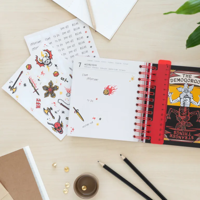 Esta agenda también cuenta con una regla que cumple la función de marcapáginas, facilitando la localización de las páginas más importantes. Además, incluye 8 láminas separadoras, 16 ilustraciones temáticas de Stranger Things, 2 páginas de pegatinas para decorar y personalizar las anotaciones, así como un práctico sobre interior para guardar documentos de importancia.