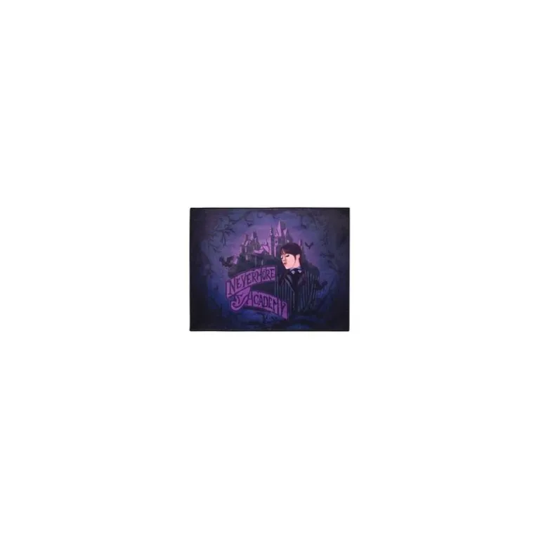 Descubre la alfombra interior de Nevermore Academy, inspirada en Wednesday. Con unas dimensiones de 80×60 cm, esta alfombra es ideal para darle un toque especial a cualquier habitación. El diseño presenta un fondo oscuro con detalles en tonos púrpura y negros, destacando la figura de un personaje emblemático rodeado de elementos góticos.