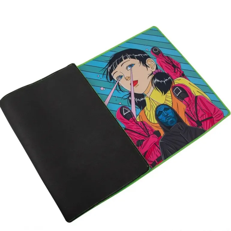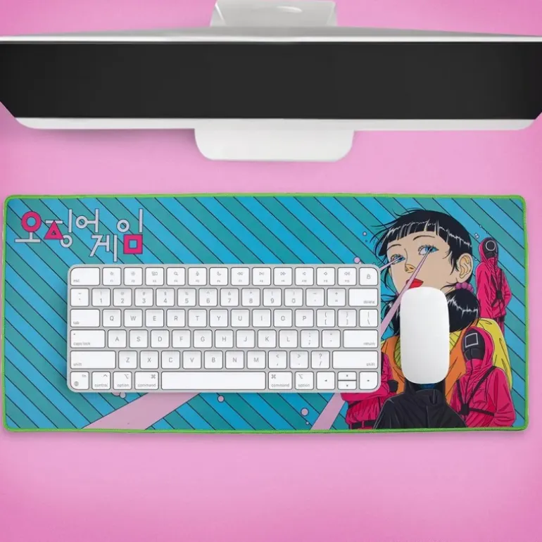 La alfombrilla de escritorio Young-Hee inspirada en Squid Game es un artículo imprescindible para los seguidores de la serie. Con un diseño vibrante, la alfombrilla destaca por su ilustración detallada de Young-Hee, rodeada de los enigmáticos personajes en uniforme rojo. La escena está capturada en una base azul con líneas diagonales y detalles en rosa, creando un efecto visual impactante.