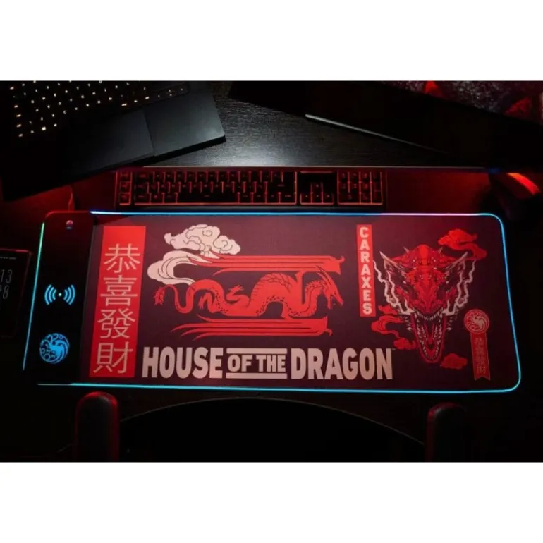 Sorprende con sus colores rojos y negros intensos, decorados con ilustraciones temáticas de dragones y el logo de la serie. Un destacado ribete de iluminación LED bordea la alfombrilla, ofreciendo un ambiente único y personalizable para tu setup de juegos.