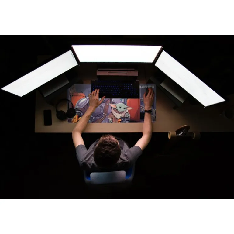 Descubre la alfombrilla de ratón XL de Star Wars The Mandalorian, un accesorio imprescindible para los amantes de la saga galáctica. Presenta un cautivador diseño que muestra a los icónicos personajes del Mandalorian y The Child, también conocido como Baby Yoda, en una detallada ilustración con tonos vibrantes y nítidos que capturan la esencia épica de la serie.