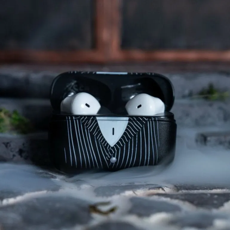 Descubre la magia de Pesadilla antes de Navidad con estos auriculares inalámbricos TWS Buds Pro de Jack Skellington. Con un diseño único y detalles cuidados, estos auriculares son un complemento perfecto para cualquier fan de la icónica película. El estuche de carga presenta la emblemática imagen de Jack, con su característico traje a rayas blancas sobre fondo negro, mientras que los auriculares en sí están adornados con pequeñas calaveras en blanco y negro, evocando el estilo inconfundible de Halloween Town.