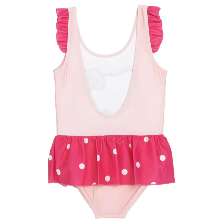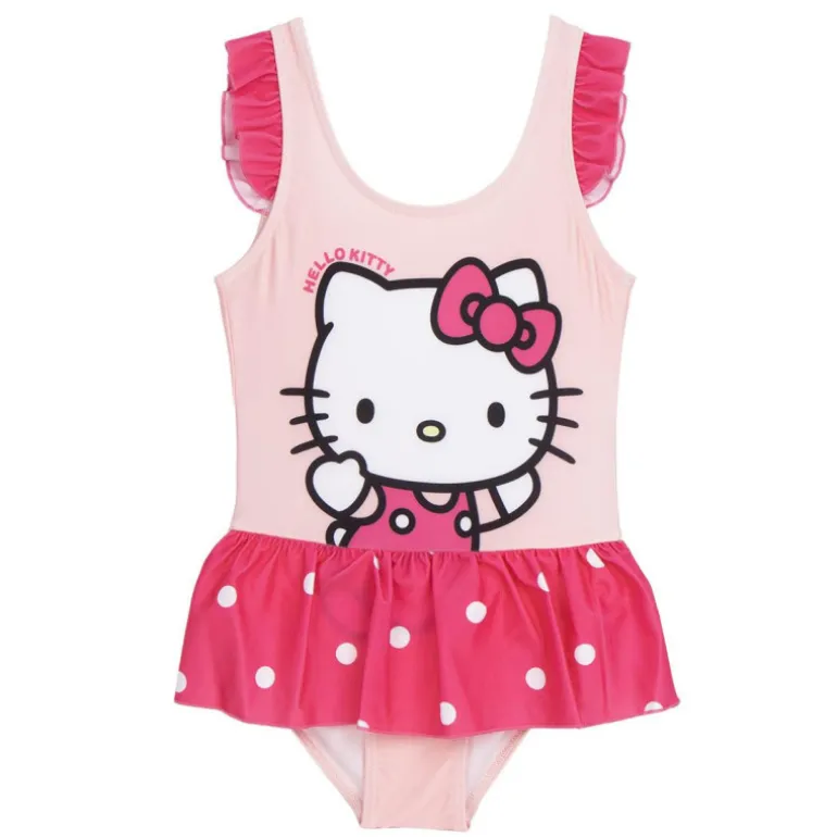 Descubre la encantadora ropa de baño Hello Kitty, ideal para los días soleados en la piscina o la playa. Este bañador destaca por su diseño divertido y colorido, presentado en una suave tonalidad rosa. La parte superior cuenta con un estampado grande de la famosa gatita, acompañada de un lazo en su cabecita, mientras que la falda con volantes en la parte inferior añade un toque juguetón. Los lunares blancos sobre el fondo fucsia de la falda le dan un estilo único y alegre.