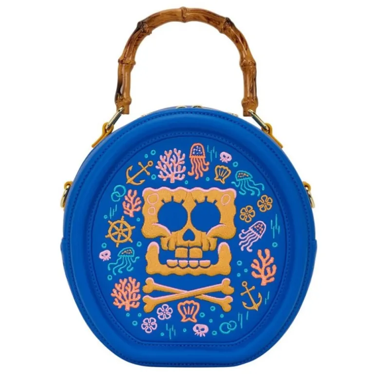El vibrante color azul se complementa con un asa de apariencia de bambú, ofreciendo un toque original y distintivo. Destaca la decoración en relieve del icónico símbolo pirata de Spongebob, rodeado de detalles marinos multicolores. En la parte trasera, la bandolera presenta un gráfico de una rosa de los vientos, añadiendo un detalle náutico adicional.