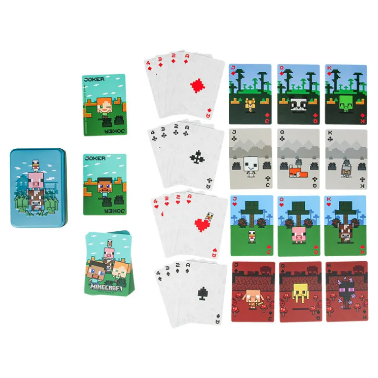 Las cartas son coloridas y cada una está ilustrada con personajes y escenas del universo Minecraft, ofreciendo una experiencia visual única en cada partida. Las figuras como el rey, la reina y el joker destacan por sus representaciones creativas dentro del mundo del juego.