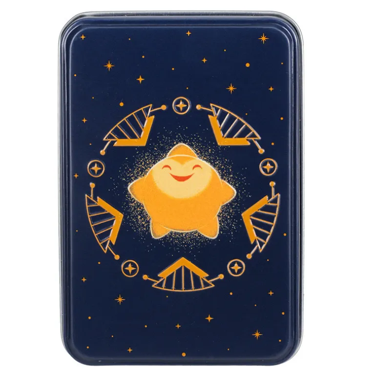 Descubre la elegancia y magia de esta baraja de naipes con licencia oficial, que hará las delicias de los seguidores de Disney. Esta exquisita caja metálica presenta un diseño en tonos azul oscuro adornado con una encantadora estrella dorada en el centro, rodeada de elementos cósmicos y pequeños detalles que evocan el universo de Disney Wish. Las cartas lucen ilustraciones vibrantes de personajes queridos, cada una inmersa en una atmósfera de fantasía estelar.