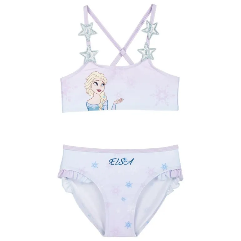 El sujetador presenta un hermoso diseño en tonos lilas, adornado con estrellas brillantes en los tirantes, haciendo eco de la mágica historia de Elsa. En la parte frontal, se destaca una imagen de la protagonista, que hará que cualquier niña se sienta como una verdadera reina del hielo. La parte inferior, también en tonos lilas, está decorada con copos de nieve, aportando un toque divertido y alegre.