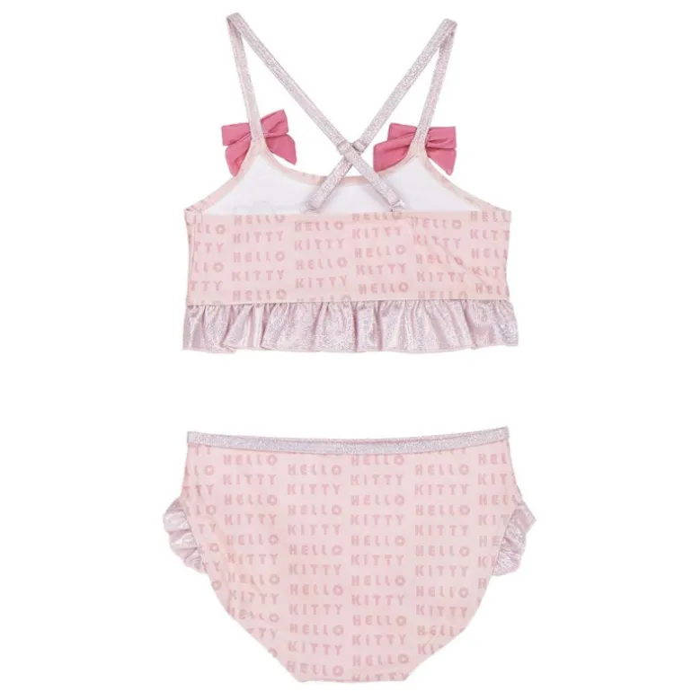 La parte superior cuenta con un estampado repetido de la marca, mientras que la parte inferior muestra a Hello Kitty en un diseño encantador. Además, las ricas texturas y los acabados brillantes hacen que este bikini sea verdaderamente único, ideal para las pequeñas que buscan lucir adorables en la playa o la piscina.