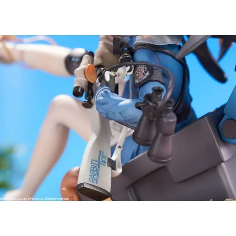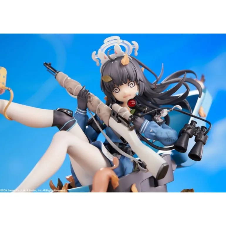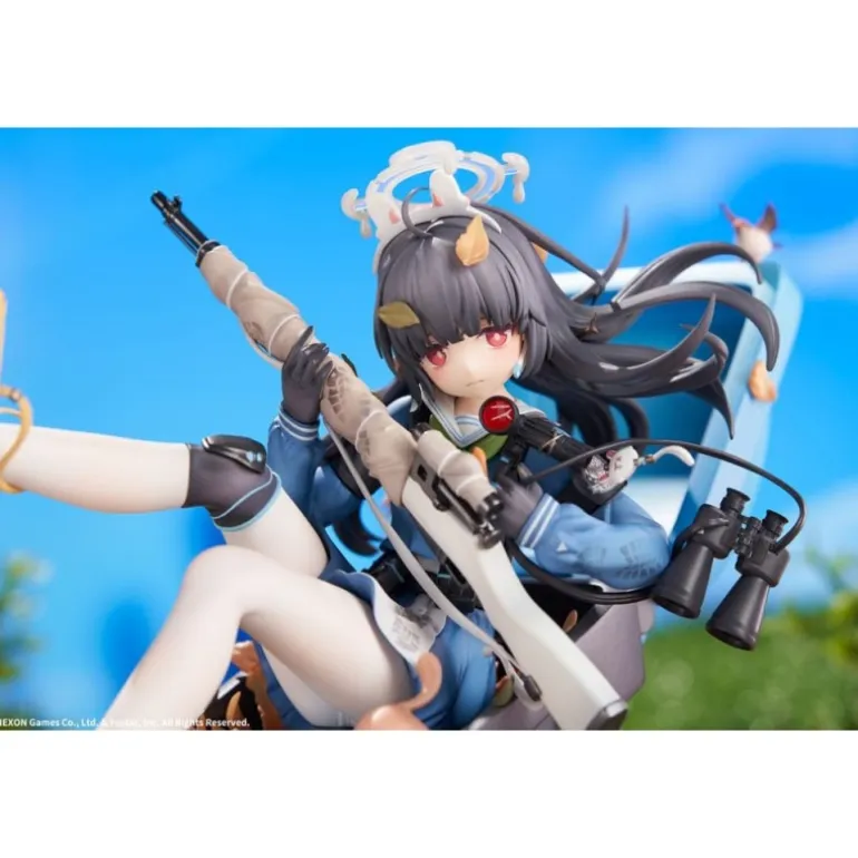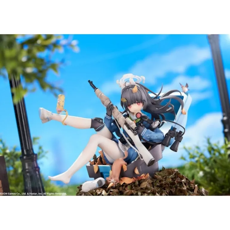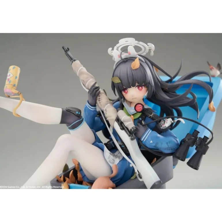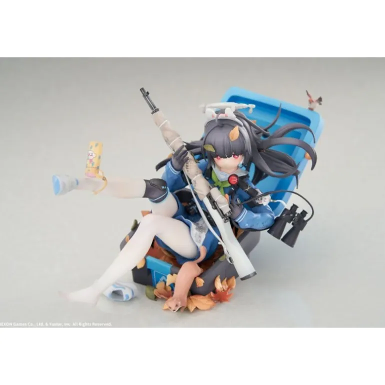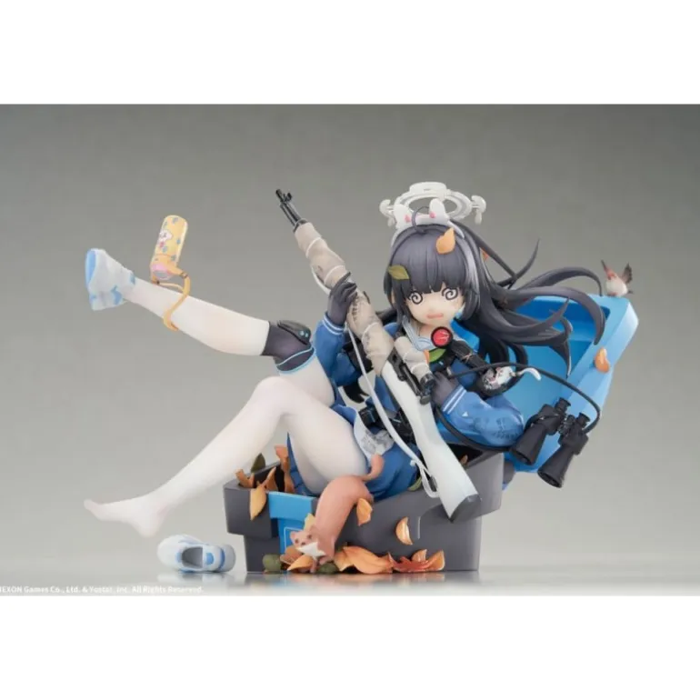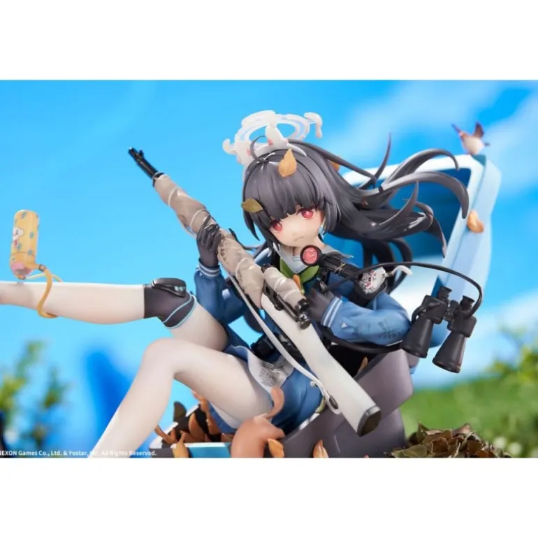 Miyu sostiene un rifle con precisión, mientras sus pies descalzos añaden un toque de vulnerabilidad y juventud. El esculpido incluye accesorios como un par de binoculares y hojas otoñales decorando la base, aportando un entorno natural a la escena.
