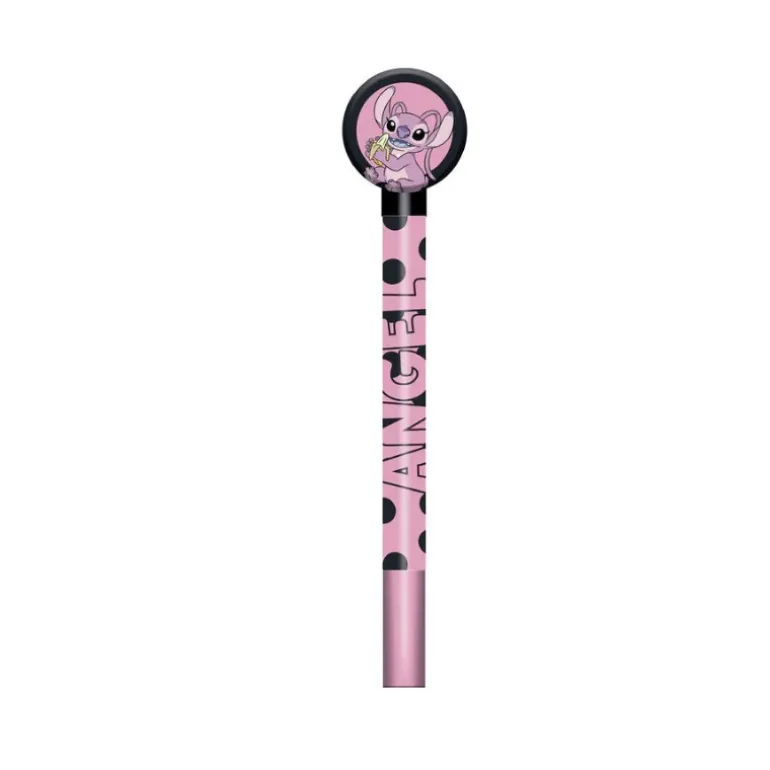 El bolígrafo presenta un fondo rosa con lunares negros, decorado con la palabra «Angel» en letras grandes y llamativas. Su diseño se completa con un topper en la parte superior que muestra a Angel, el encantador personaje de Disney, en tonos rosados y negros, lo que añade un toque especial y personal al producto.